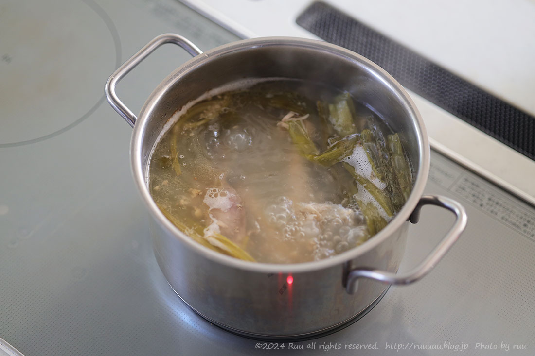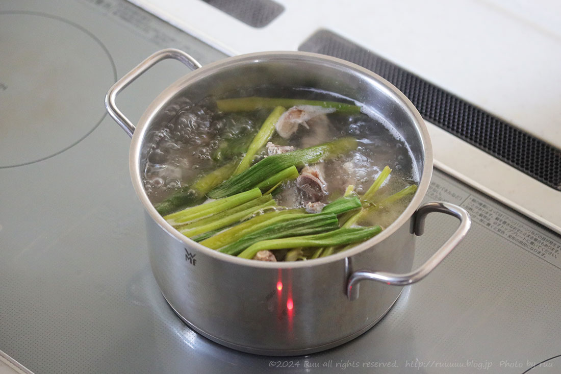 まず骨は、水、酒、生姜、にんにく、ネギの青い部分と一緒に鍋に入れ、ごいっごいと煮出します。私はこの臭みがちょっと苦手なので、大量のネギを投入。骨は多少肉がついてても全然問題なしです。むしろいい味がでて〇。