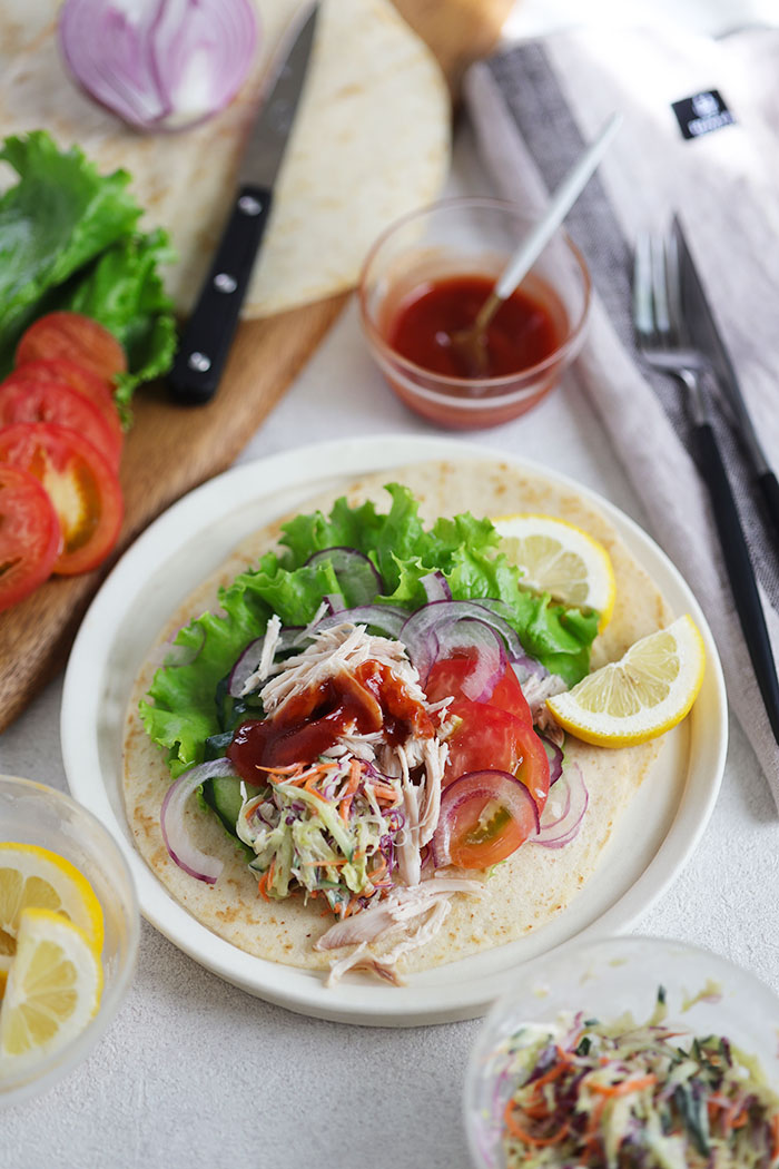 こちらはコールスローサラダ、ほぐした胸肉、レタス、トマト、紫玉ねぎと合わせ、ケチャップとチリパウダーとタバスコを混ぜたソースをかけたもの。好みでレモンやライムを絞っても美味です!