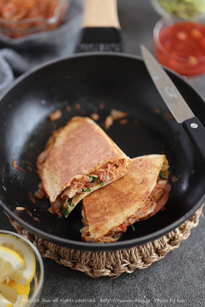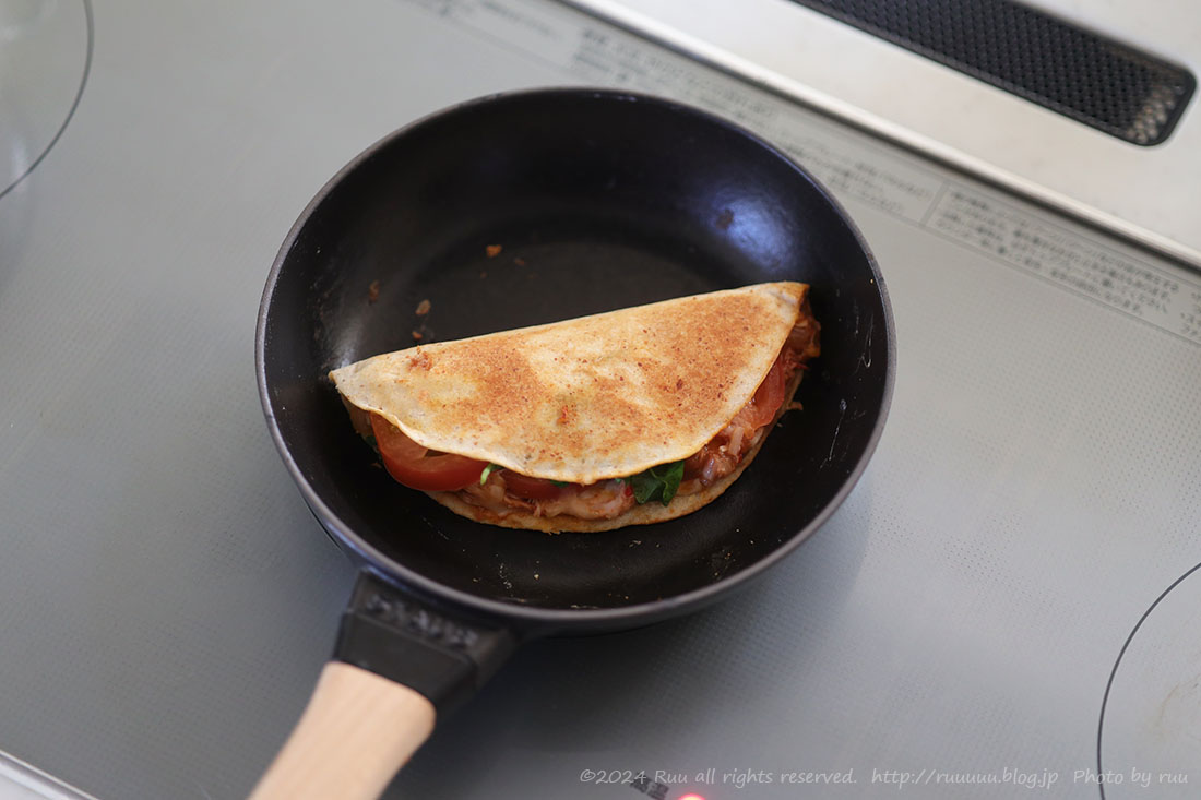 平たく焼くのがケサディーヤの醍醐味ですから、トルティーヤは半分に折りたたみ、油なしのフライパンで両面を焼いて。