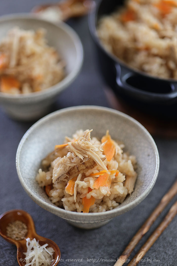 また、ほぐしたターキーに生姜やごぼう、人参などを合わせ、醤油・みりん・酒を入れてご飯を炊けば、炊き込みご飯に(もちろん炊飯器で炊いてOKです)。
