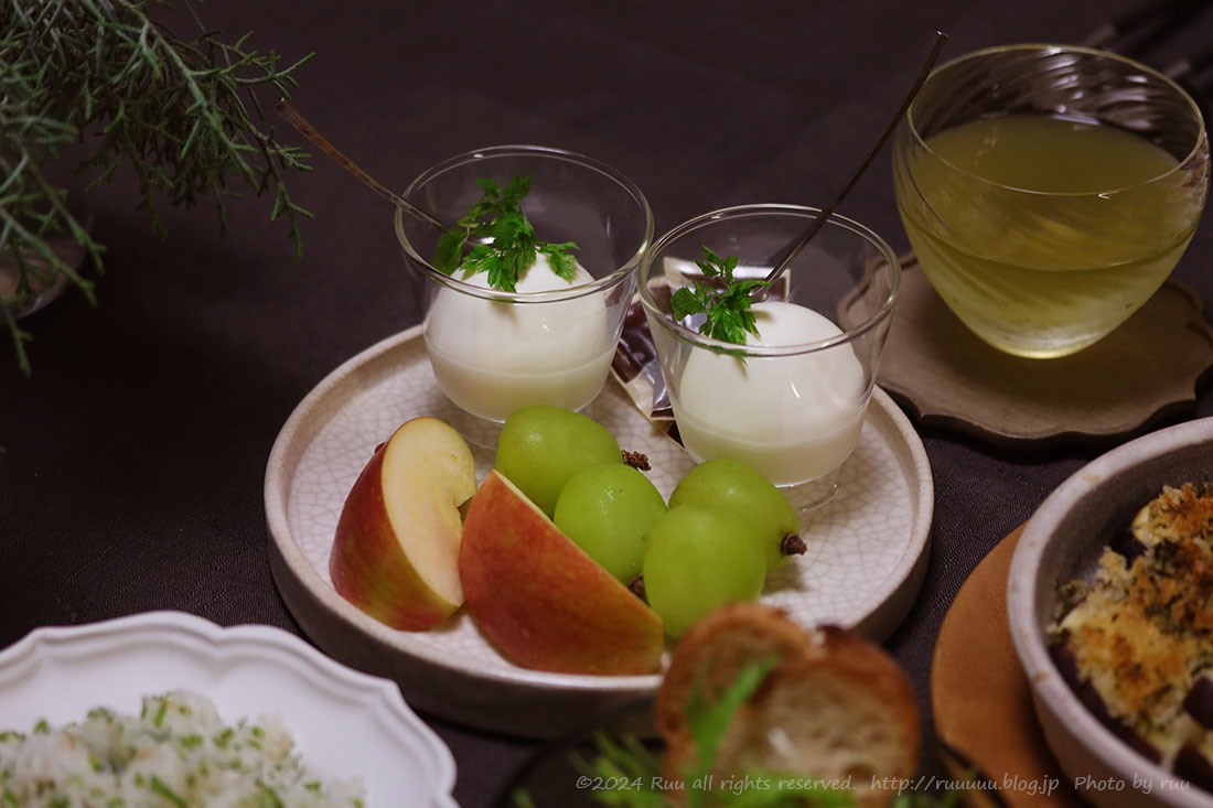 〆のデザートは、牧家のミルクプリン&りんご&シャインマスカットで↓