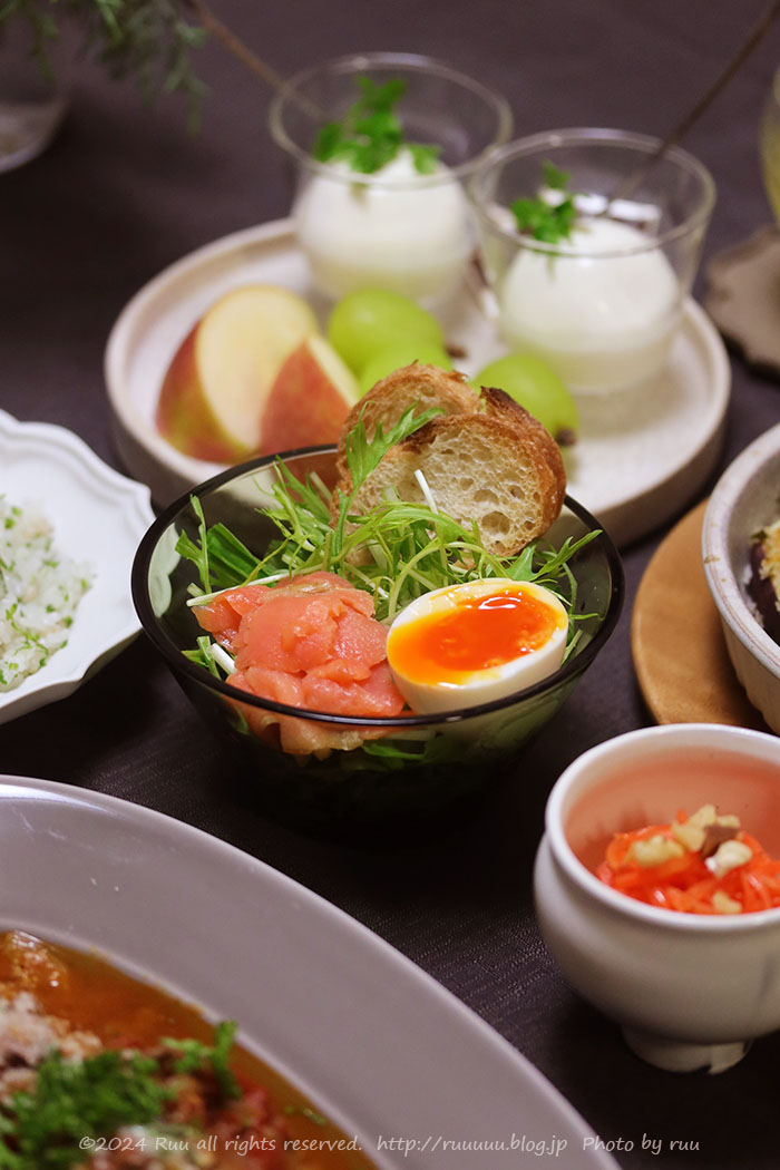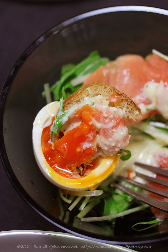 そんなことを話しながら、水菜とスモークサーモンのシーザーサラダを食べて↓