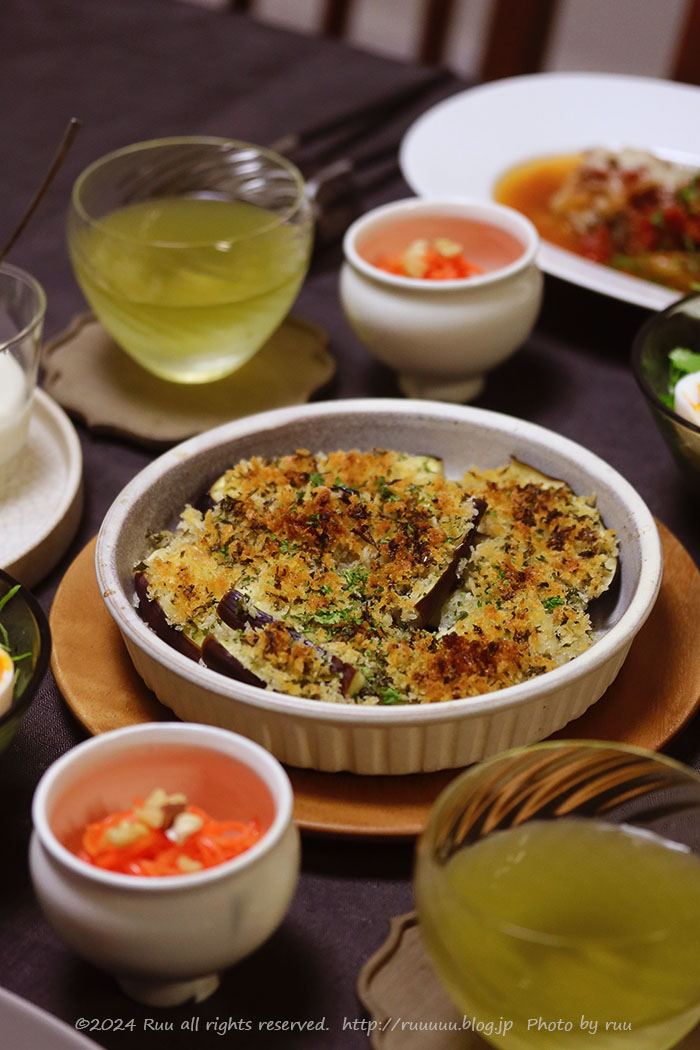 私「そうそう、茄子もぷりっぷりで美味しそうだったからさ、パン粉焼きにしてみたの。」