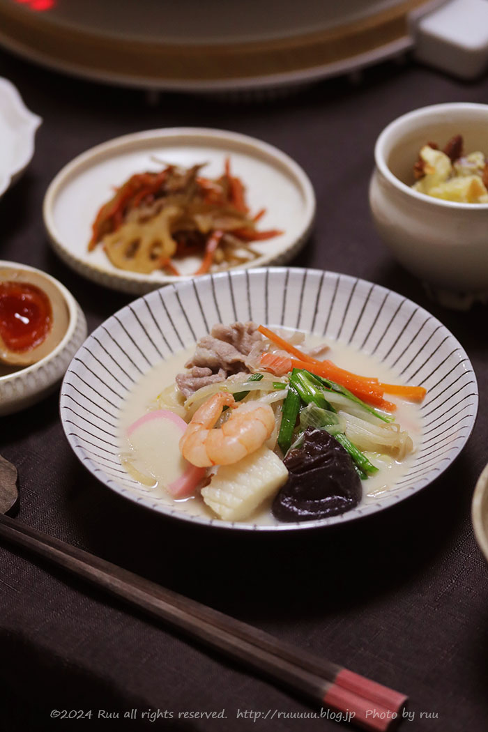 ちゃんぽん鍋と、ごちそうきんぴらと、さつまいもとクリームチーズとナッツのサラダをちょっとと、搾菜と、フルーツ。