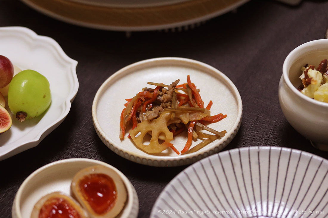 れんこん、ごぼう、人参、豚肉入りのきんぴらを、なぜか我が家は「ごちそうきんぴら」と呼びます。