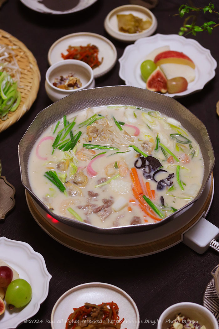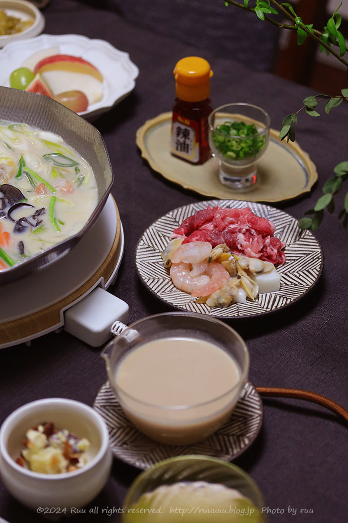 スープや、お肉、シーフードミックスや、味変用の薬味なんかも置いといて、