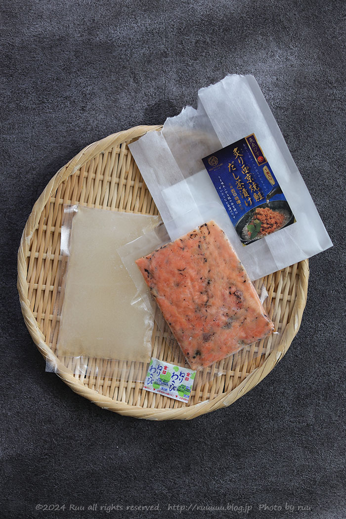 セットの内容は、ほぐし身、お出汁、わさびですが、わさび付きなのは、炙り西京焼鮭と、炙り鮭塩糀焼、炙り真鯛の3つだけ。