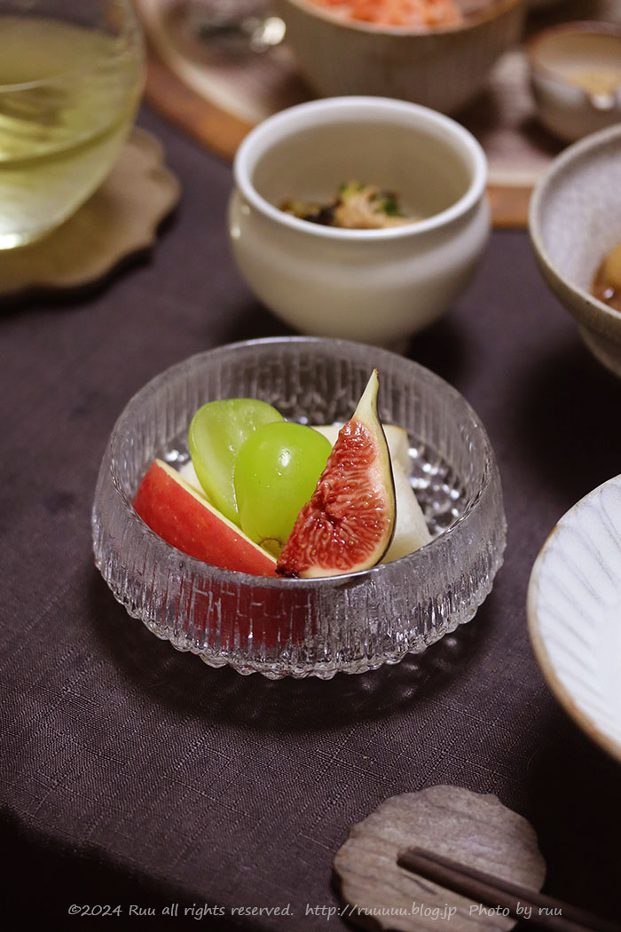 〆のデザートは、梨とりんごとシャインマスカットといちじく。
