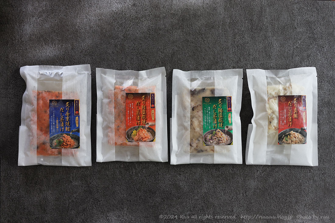 ちなみに、ひと箱に、炙り西京焼鮭だし茶漬け、炙り鮭塩糀焼だし茶漬け、炙り真鯛だし茶漬け、炙り鰆塩糀焼だし茶漬け・・・と、4種ものだし茶漬けが入ってるので、