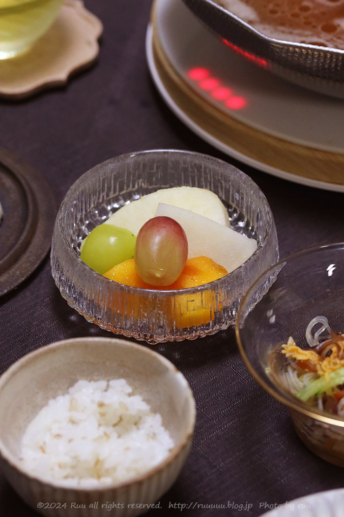 〆のデザートは、梨、りんご、シャインマスカット、サニードルチェ、柿。