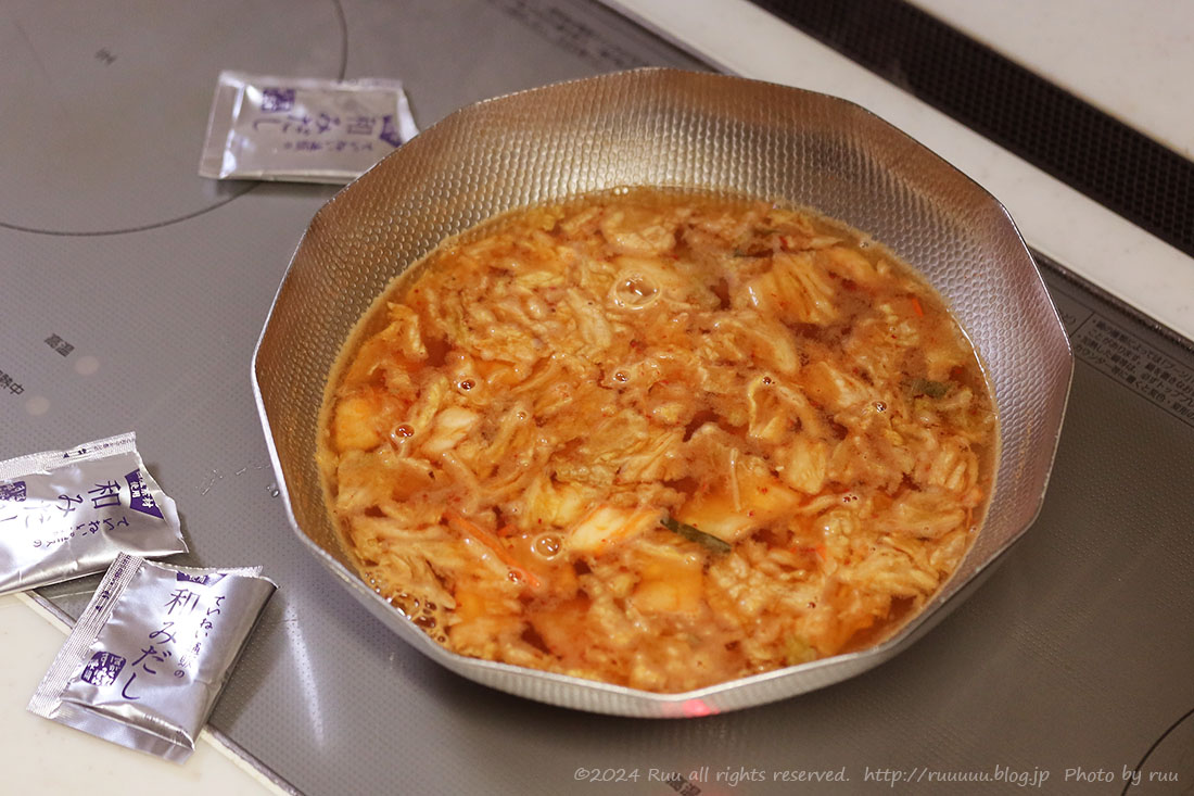 まずはお鍋に、水800cc、酒大さじ2、みりん大さじ2、キムチ100g、和みだし3袋を入れてひと煮たち。