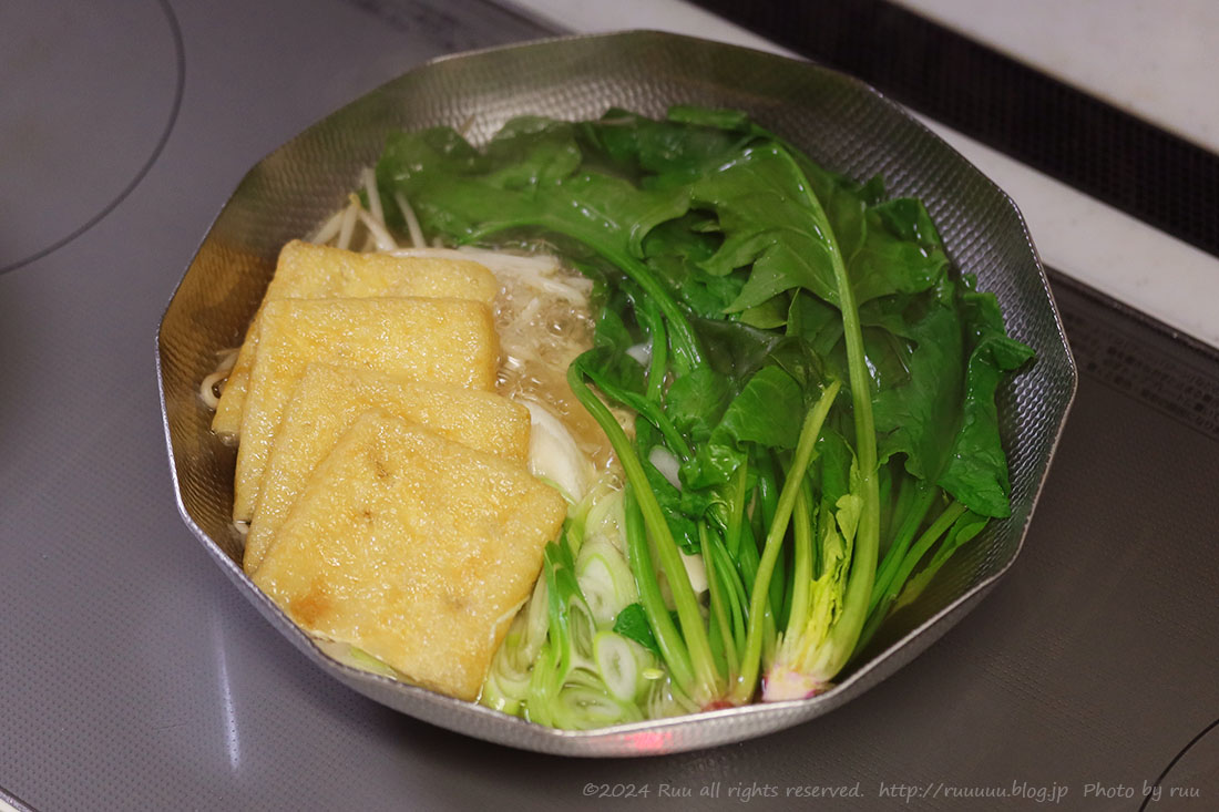 油揚げやもやし、豆腐やネギ、ほうれん草などを入れ、ひと煮たち。