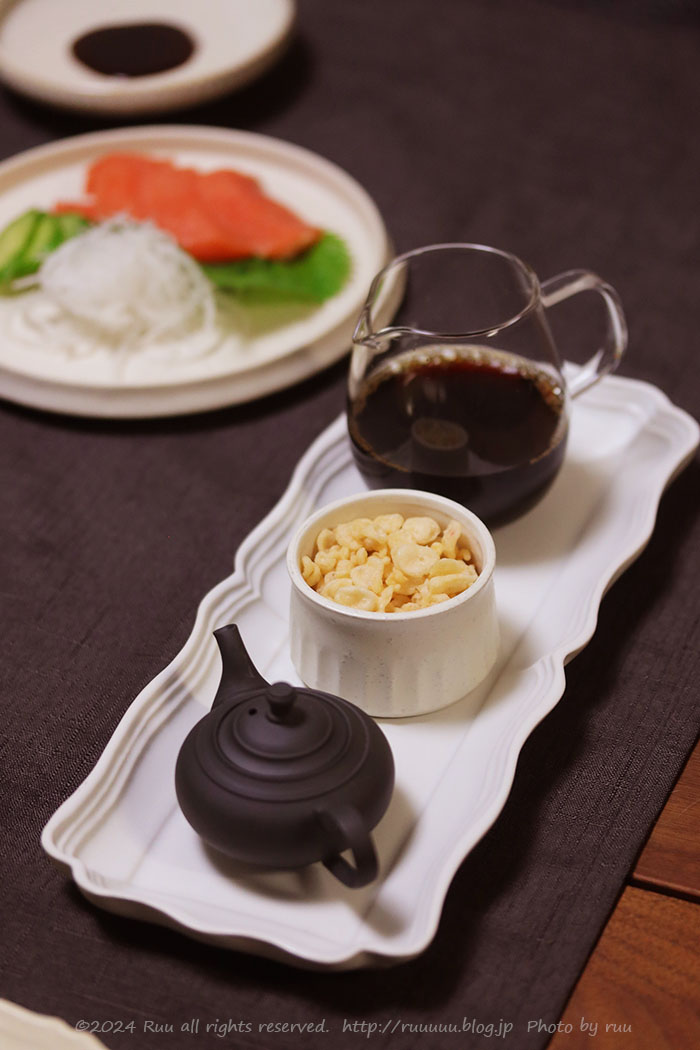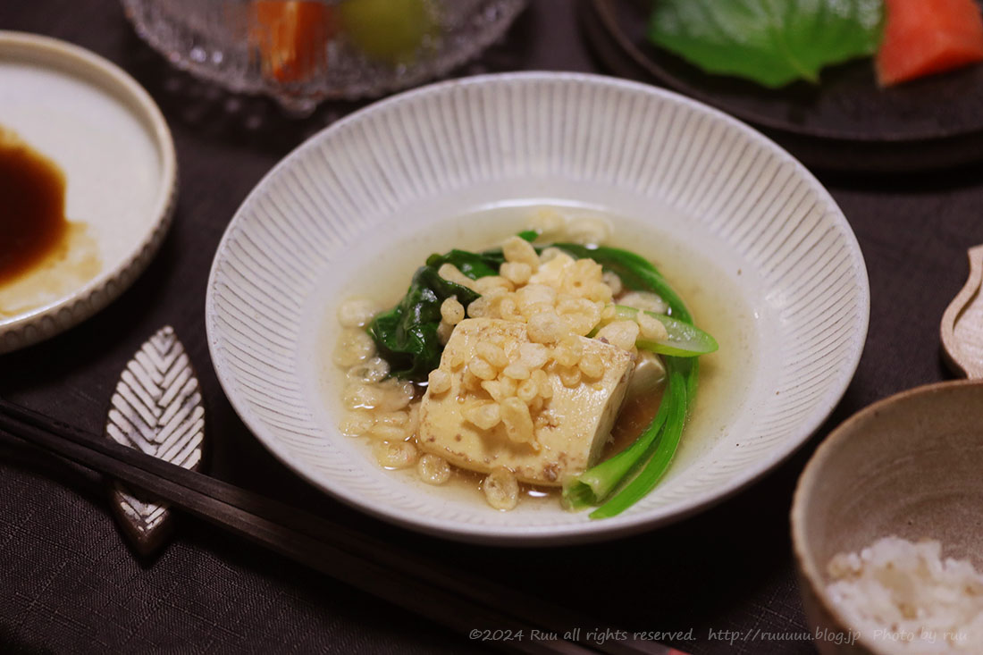 熱々のお豆腐にお出汁をたっぷりはって、めんつゆちょろっと+揚げ玉たっぷり。
