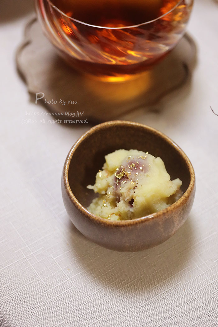 〆のデザートは今年唯一作ったおせち、栗きんとん。