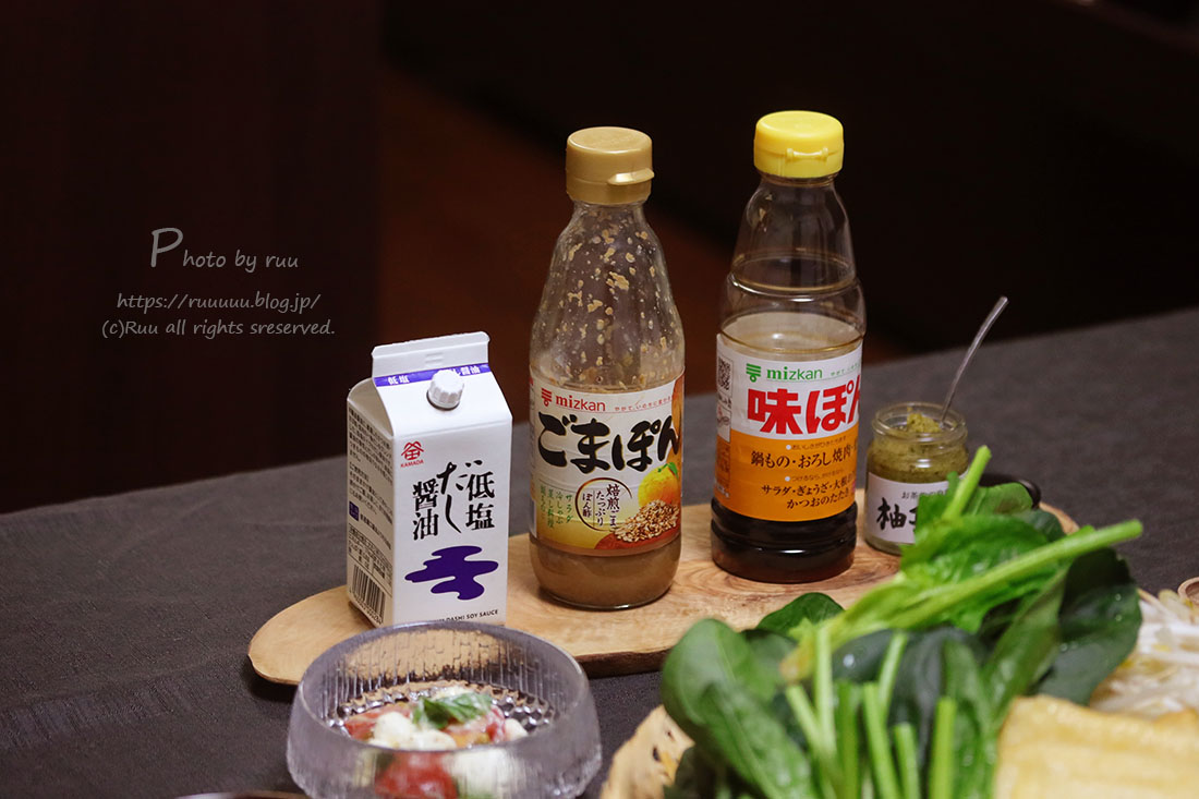そして出汁しゃぶのつけダレは、ポン酢、ごまぽん、だし醤油、柚子胡椒。