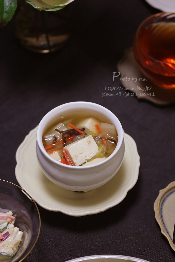 豆腐がもりっと入ったとろとろ白菜のスープも飲んで。