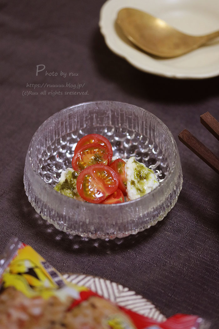 ミニトマトとモッツァレラリーズのカプレーゼ(こちらも多分前日の残り)を食べて。