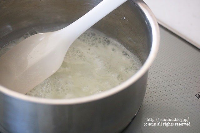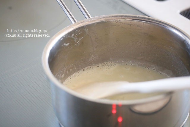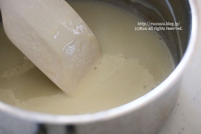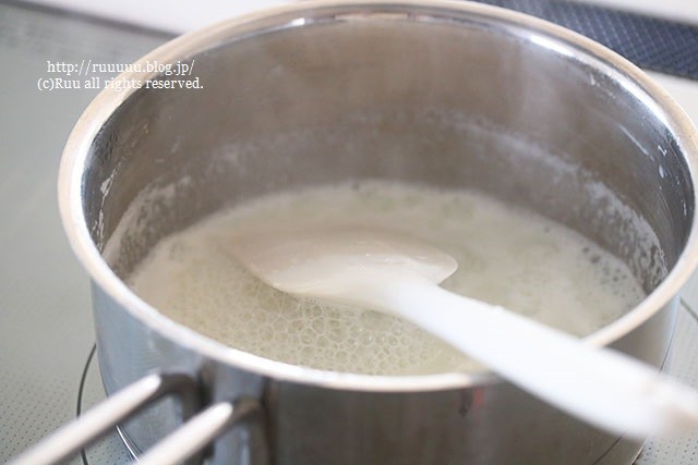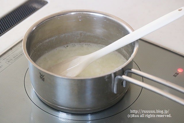 ゴムベラでぐるぐるぐる。鍋肌についた牛乳の塊(タンパク質)もこそげとって。