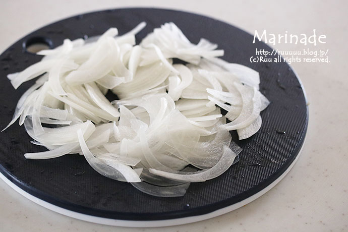 玉ねぎを入れて5分くらい置くと、マリネ液と馴染みますんで。