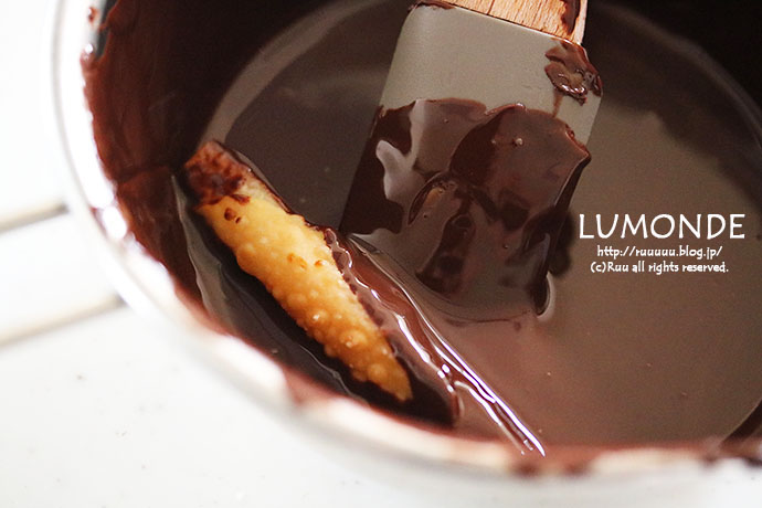 つけすぎてもチョコレートが流れてしまうので、ボウルの端で余分なチョコレートを落とす。