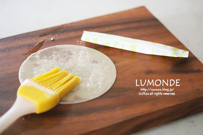 2:餃子の皮にうっすらとバターを塗り、グラニュー糖をかける。