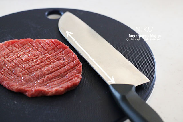 1:肉は包丁の背で軽く叩く。