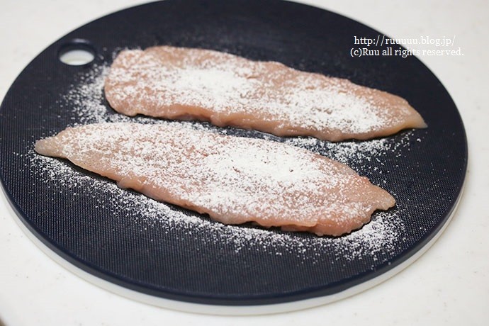2:キツめに塩・胡椒をふり、茶漉しなどでささみに小麦粉をふる。