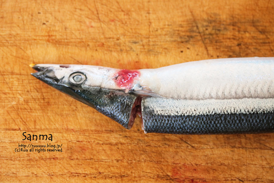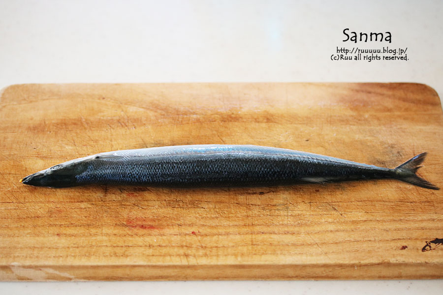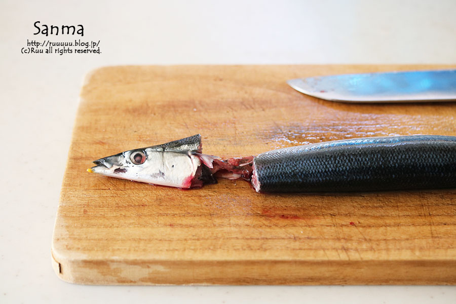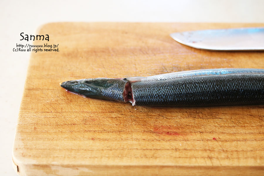 まな板の上に秋刀魚を置く。