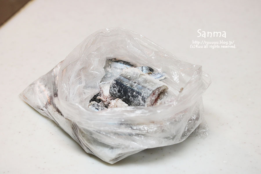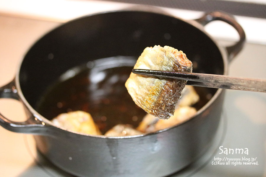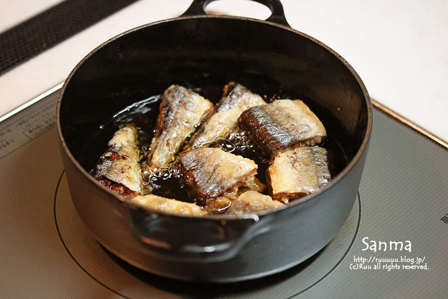 5:鍋にサラダ油を熱し、4の秋刀魚を弱火で揚げる。