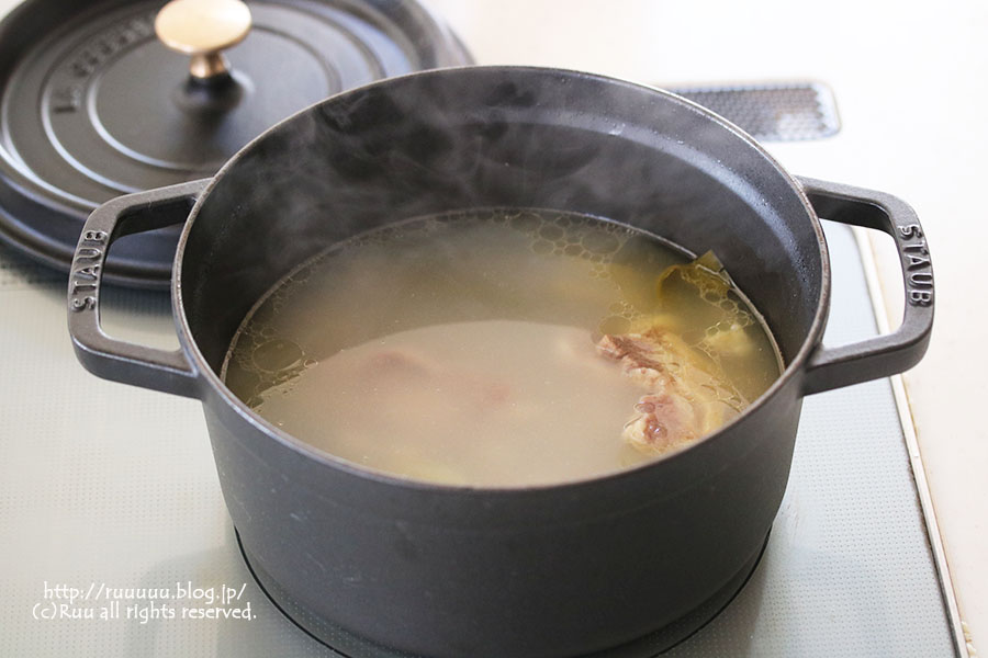 沸騰するとぼっこぼことアクがでます。これが臭みの元になるので、このお湯はいったん捨てます。