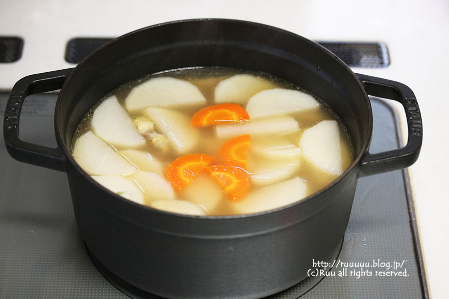 うちは下茹でした大根を使ってますが、面倒なら生のままでも。