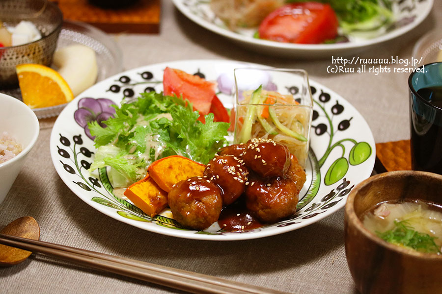 肉団子、春雨サラダ、焼きかぼちゃ、グリーンサラダ。