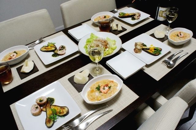 おばんですーるぅです本日の晩ご飯 チキンのチーズジェノベーゼロール なすのグリル添え・小エビのトマトクリームリゾット・アボカドと自家製カッテージチーズのサラダ 山葵ドレッシング・ひなのとってきた梨・白ワインこの白ワイン。昨日さぶろー山にねだられて仕方なしな