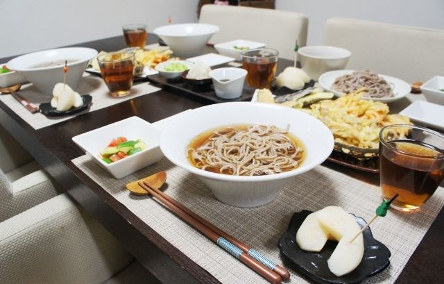 昨日の晩ご飯~♪ お蕎麦・天ぷら(舞茸・かぼちゃ・なす・ごぼうと人参のかき揚げ・玉ねぎと海老のかき揚げ・里芋)・たたききゅうりとトマトの山葵ポン酢和え・梨大人はほかほか温蕎麦。ひなな冷え冷え盛り蕎麦。 なんか分からんけど、うちの子、妙に冷たい蕎麦が好き。冬