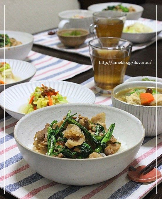 えー。本日は、いつかの晩ごはんシリーズより。「いつかの晩ごはん」。豚と春菊の丼・白菜のおかか煮・わかめの茎の甘酢漬け・芋煮ってか。窓の外を見ると、雪がもっさもさと降ってて。ついでに言えば、車も白くなってて、道路も白くて、空からは牡丹餅級の雪が降りてきてて