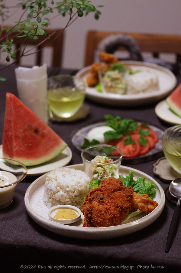 レッドホットドチキン&クリスピーチキンコールスローサラダトマトとブラータのカプレーゼ和風ヴィシソワーズすいかかわいい尻尾の主はコイヌーつい一昨日買い物に行った時は78円だったキャベツが178円で(←高くない?)、88円だったレタスが238円で(←高くない?)、98円
