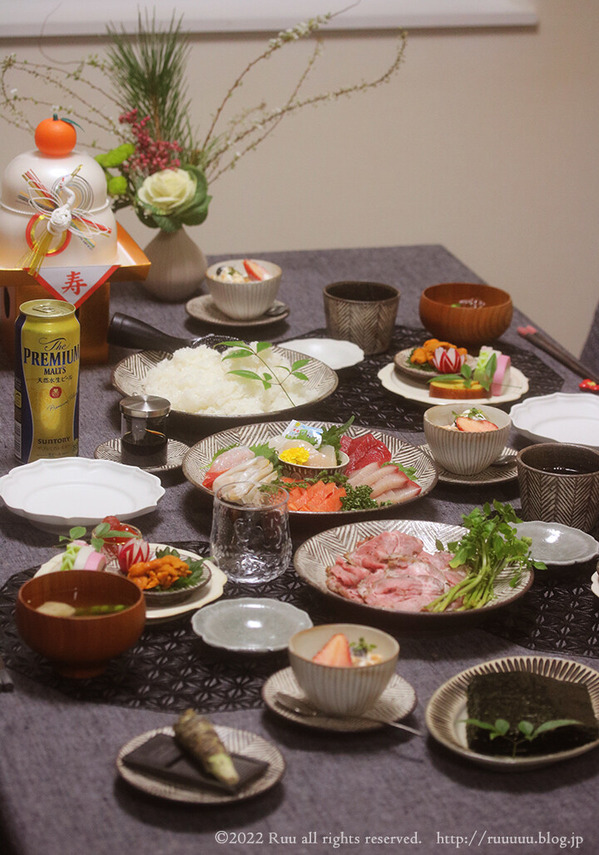 お刺身いろいろローストポーク雲丹おせちの残り酢飯2合おせちリメイクでお吸い物プリンアラモード珍しく朝からおせちにありつけた2022年の幕開け。もちろん、1日の夜はこれ↓と全く同じものを食べまして、なんなら2日の朝&昼もこれと同じものを食べまして(例のギャンブラー